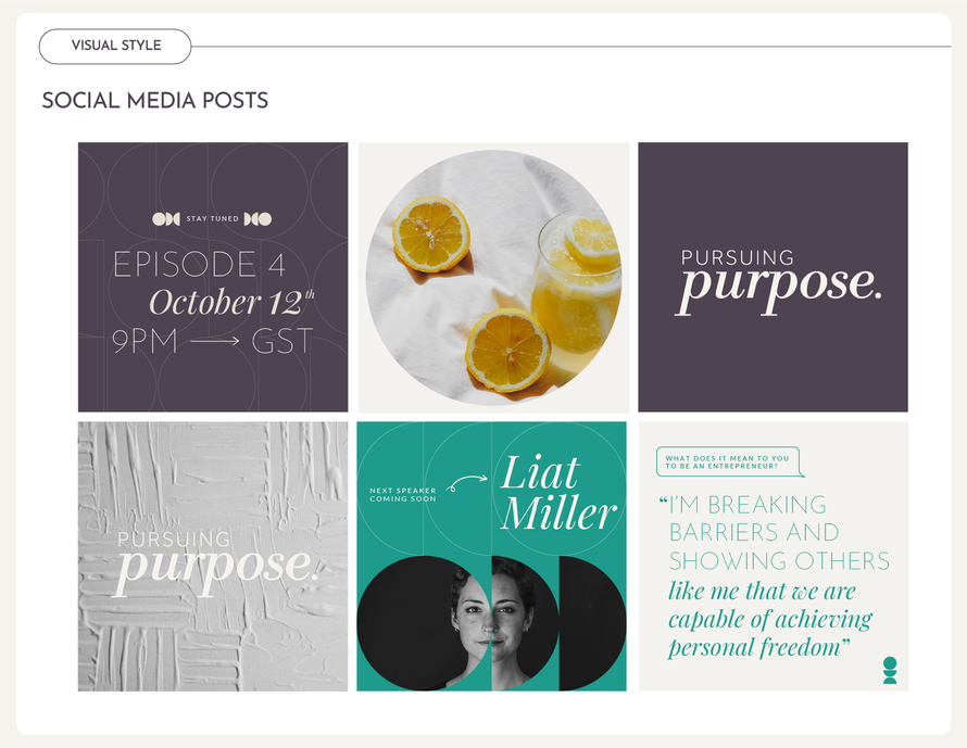 By conducting market research in the podcast industry, I developed an understanding of the current podcast branding that is already established. With this understanding, I created the creative direction and design for the podcast that specifically represented both Sheikha's identity and her career. It needed to have a natural yet vibrant vibe to it. Using a combination of bright and muted colors, along with clean geometric circles, I designed a series of design assets for her podcast, including social media posts, website banners, and podcast cover art. The geometric circles and segments represent how Sheikha is one person with multiple facets to her.